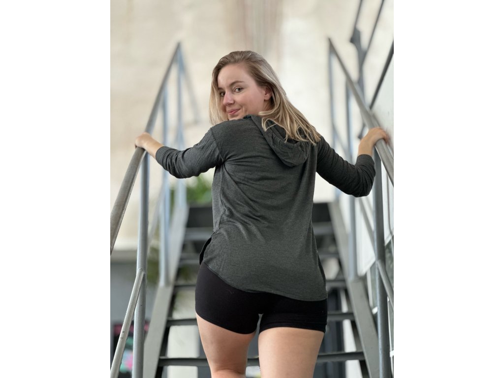 Mikina má jemně volný střih, který vás nebude omezovat v žádném pohybu. Lehce prodloužená délka dosahuje k bokům, takže se nemusíte obávat odhalených zad během jakékoli jógové pozice v sedě. Rukávy jsou přiléhavé, zakončeny jemným lemem, díky čemuž se nebudou vyhrnovat.