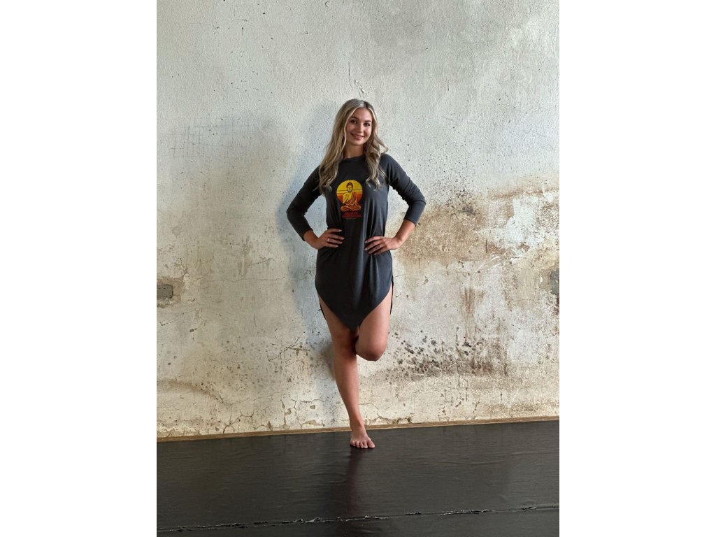 Dámské asymetrické šaty s dlouhým rukávem s potiskem Buddhy a nápisem BELIEVE IN MIRACLES mají kulatý výstřih a dlouhé rukávy.