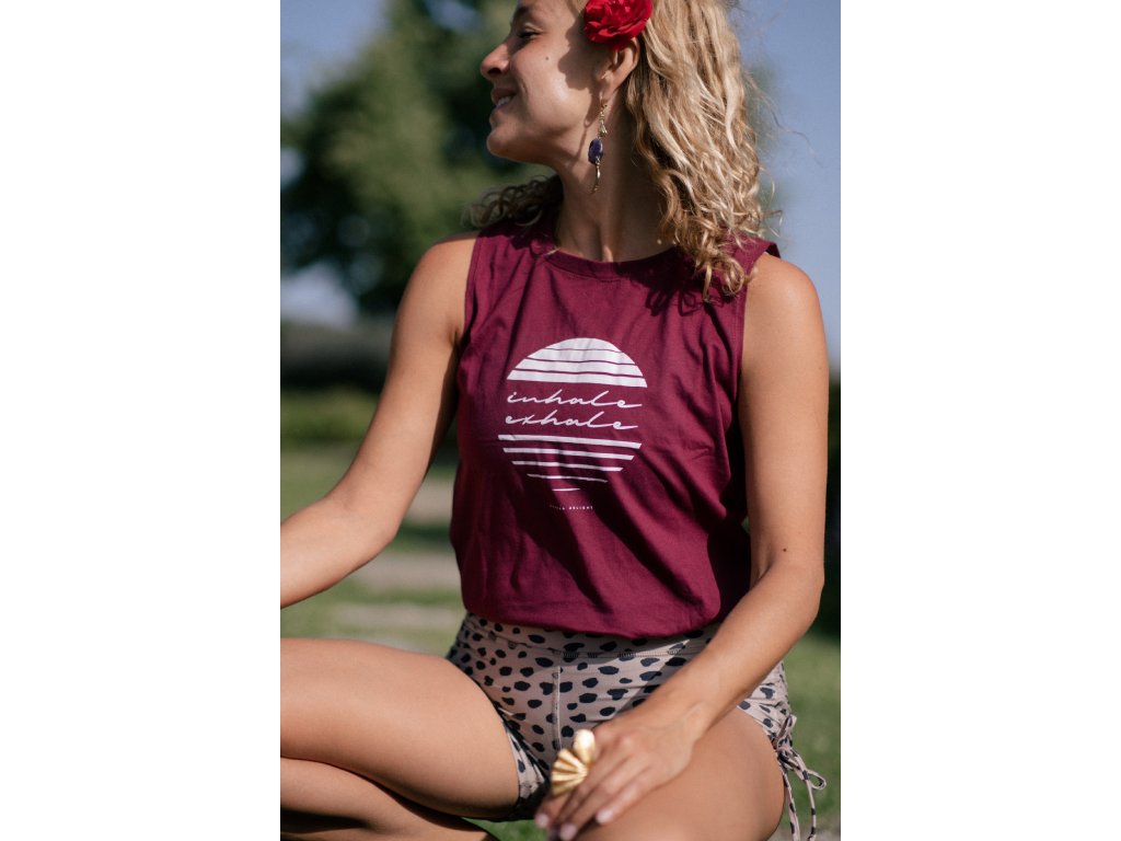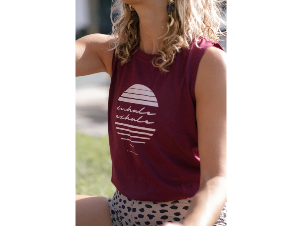 Vínové tílko jemně doplňuje autorský design značky Dharma Delight - INHALE, EXHALE (Nádech, výdech). Nápis je umístěn v kruhu, který symbolizuje slunce, měsíc nebo dechový rytmus. Poselství s důrazem na nádech a výdech je návratem k sobě, zklidňuje a harmonizuje.