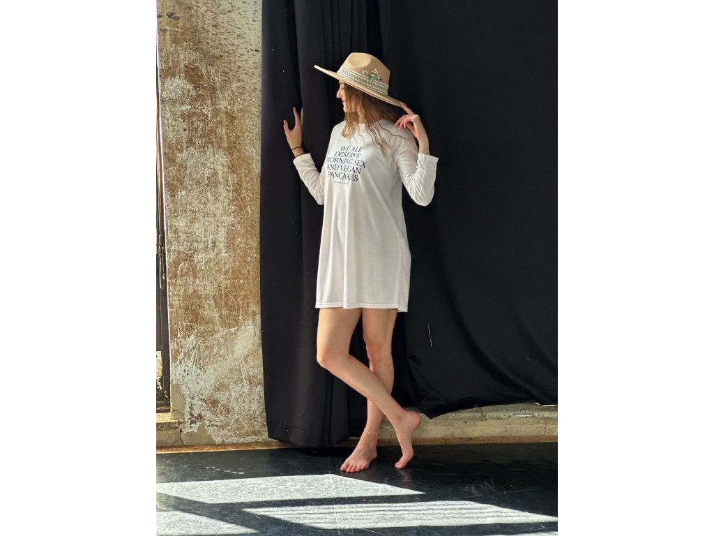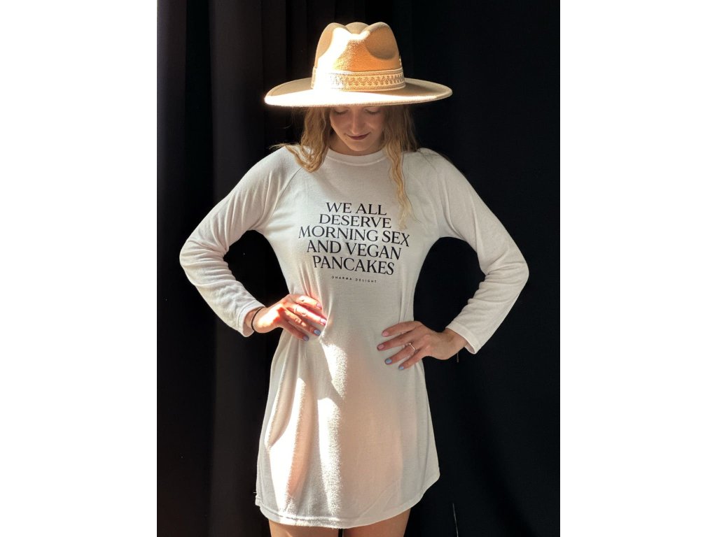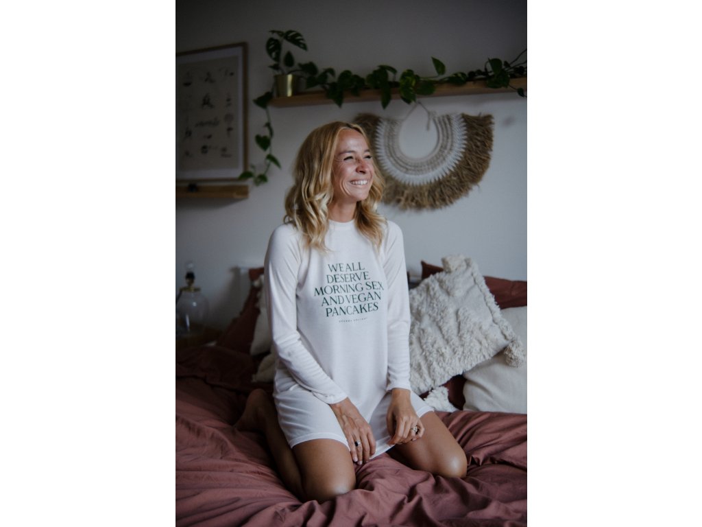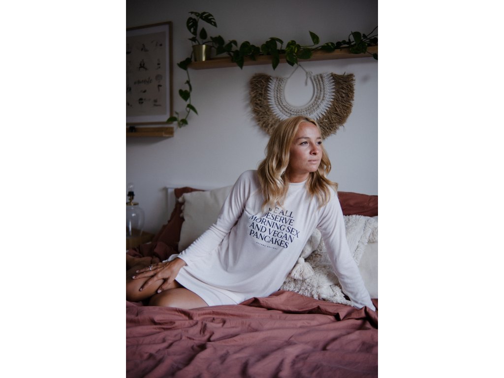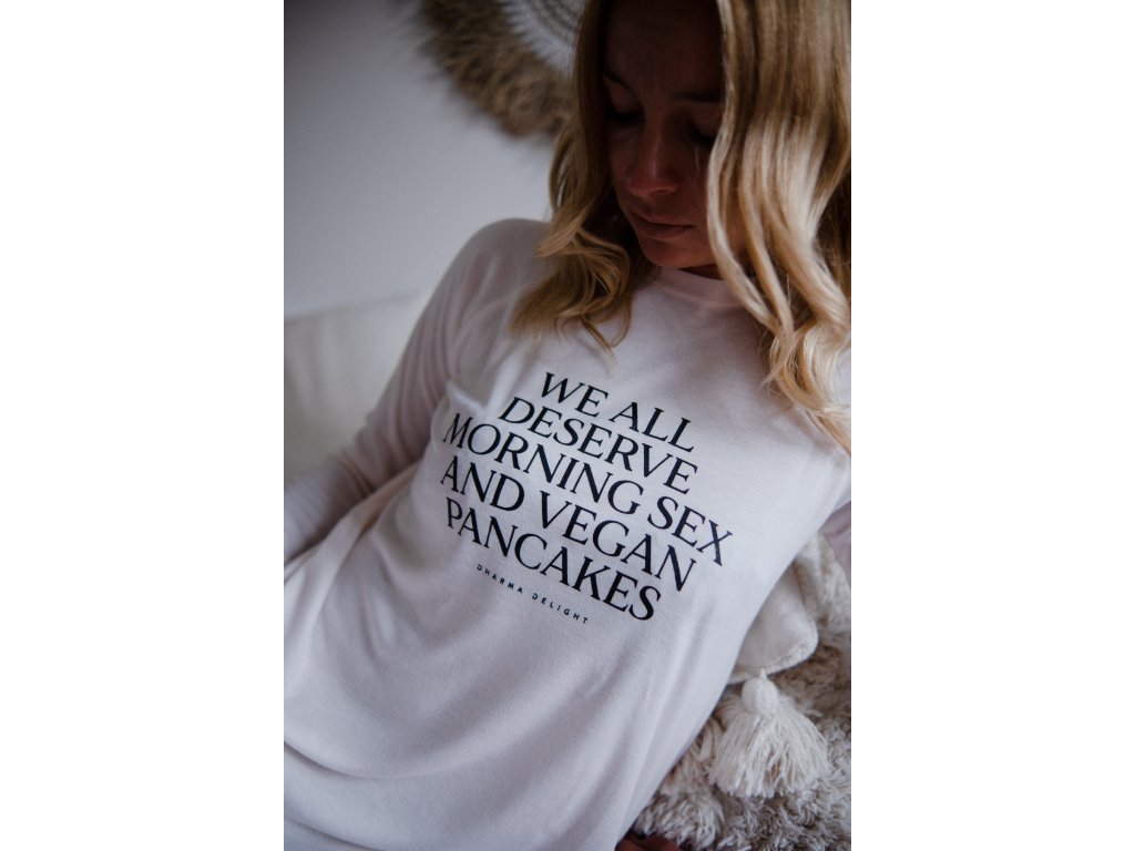 Jemnosti materiálu dominuje výrazný statement na přední straně WE ALL DESERVE MORNING SEX AND VEGAN PANCAKES (Všichni si zasloužíme ranní sex a veganské palačinky).