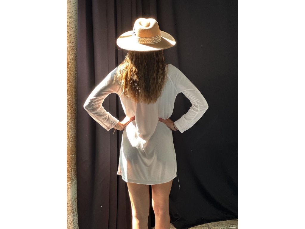 Basic střih s dlouhými rukávy a kulatým výstřihem. Volný střih šatů poskytuje svobodu pohybu a nesvazuje svou nositelku v žádné situaci.