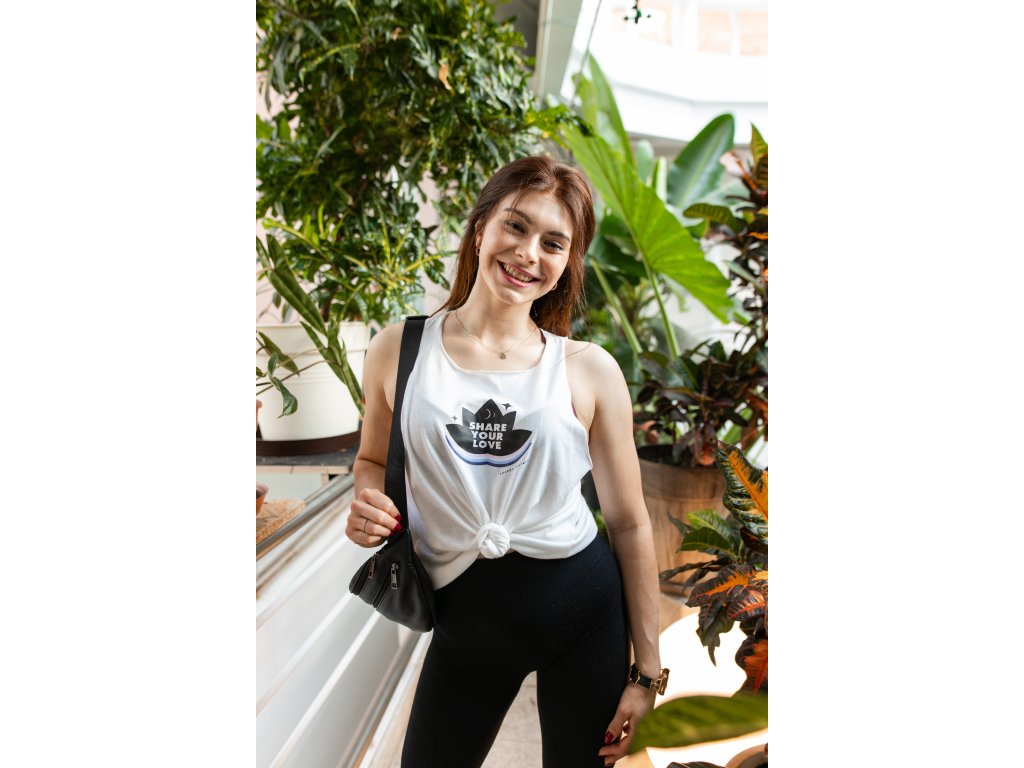Čistě bílé tílko se symbolem lotosu, ve kterém rozkvétá láska. Tílko se k dolnímu okraji mírně rozšiřuje, jemně splyne s vaší siluetou. Díky volnému střihu se toto tílko hodí pro chvíle odpočinku, na lekci jógy i na okamžiky, kdy chcete být sama (se) sebou. Jako perfektní součást byznys kostýmku vám dodá vnitřní sílu a moudrost během každého jednání i meetingu.
